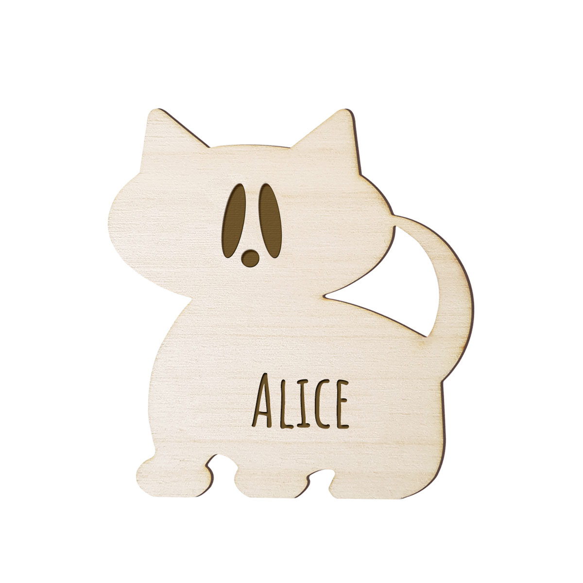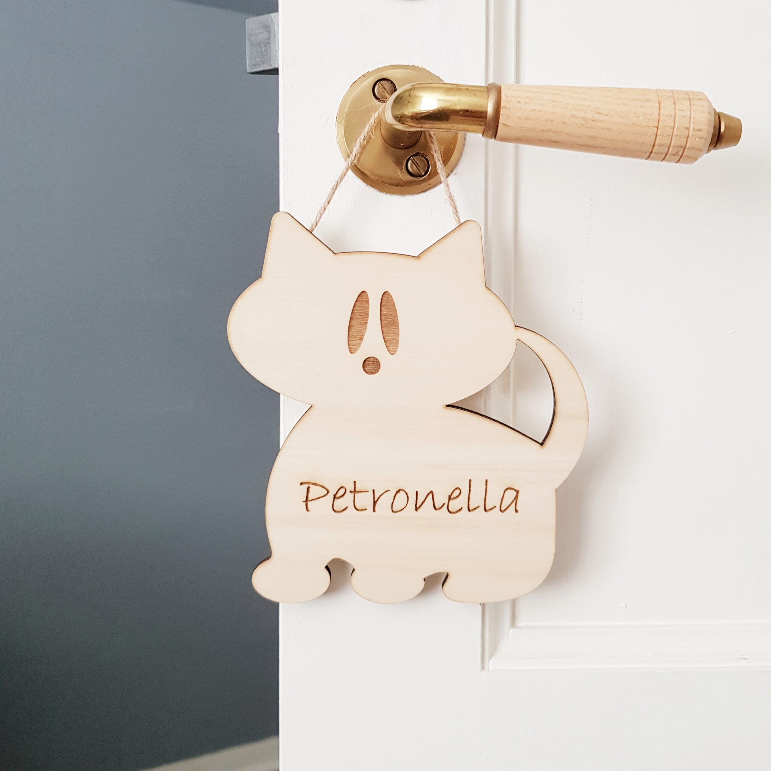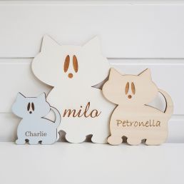 Liten namnskylt i trä med formen av en söt katt. På kattskylten graverar vi in det barnnamn du själv väljer, max 10 bokstäver får plats. Det graverade namnet får en vackert nötbrun nyans och tillsammans med den handmålade träytan, får hela skylten en fin vintagekänsla. Skylten levereras med en dubbelhäftande tejp som sitter bra på de flesta släta och rena ytor.