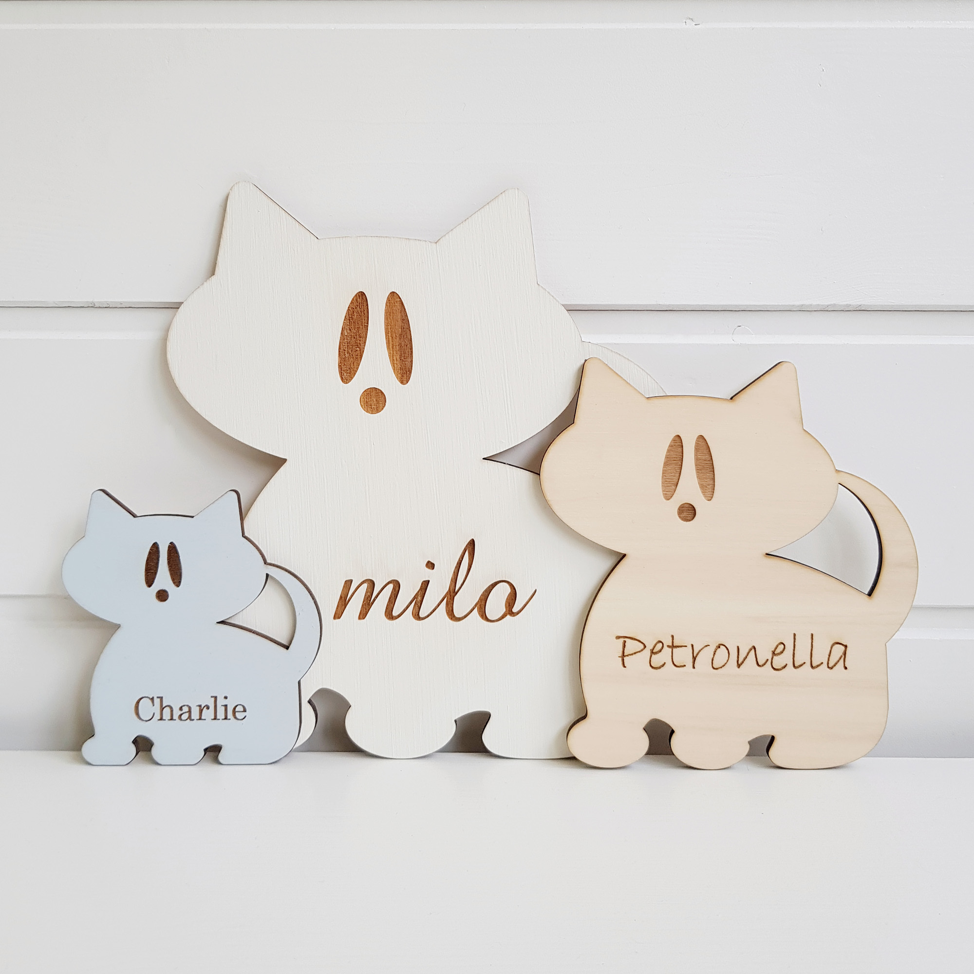 Kattskylten finns i storlekarna small, medium och large. Det gör att du kan anpassa kattskyltens storlek utifrån på vad du vill använda den till. Som dörrskylt till barnens rum passar den stora och den mellersta namnskylten mycket bra. Den minsta storleken fungerar fint när du vill märka upp klädkrokar eller kanske sätta en personlig touch på diverse inredning som t ex finförvaring och barnmöbler.