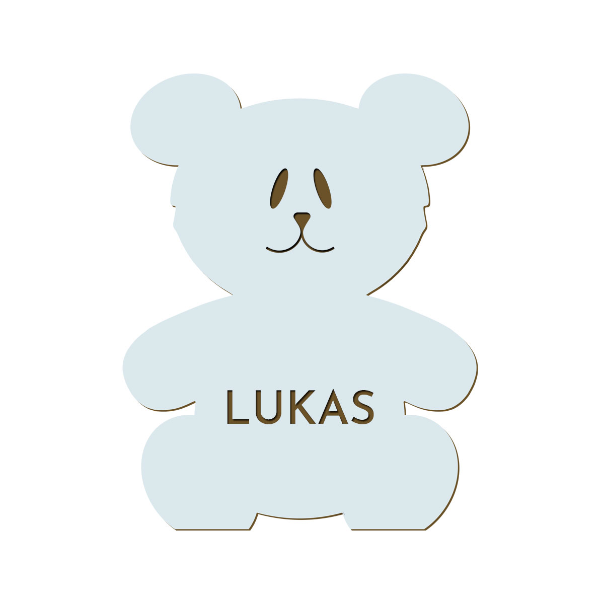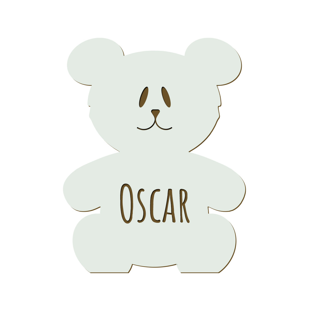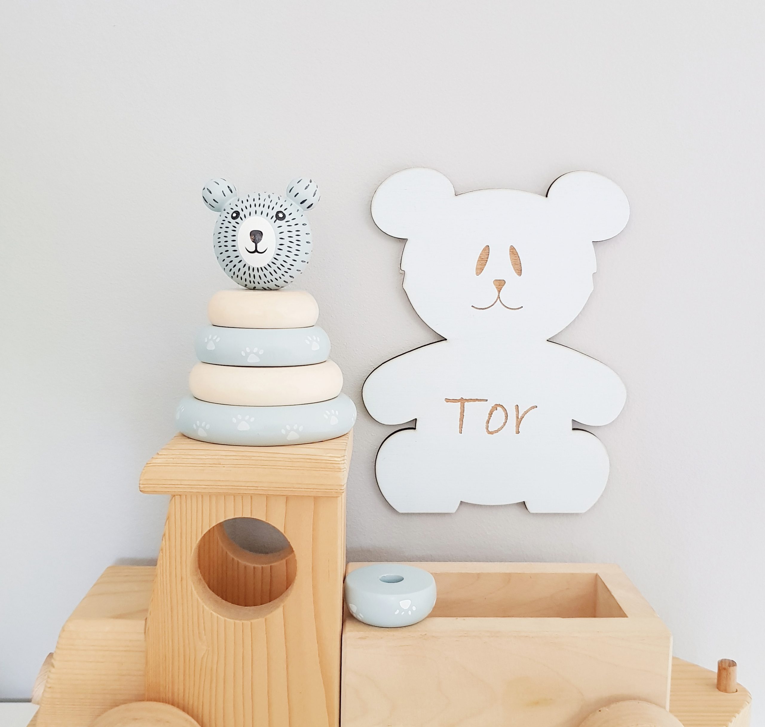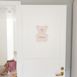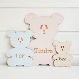 Söt, liten nalle med namngravyr på magen. En personlig skylt i trä som passar att hänga på dörren eller ovanför sängen i barnens rum. Den minsta storleken passar även bra till att märka upp finförvaring och klädkrokar på väggen med.